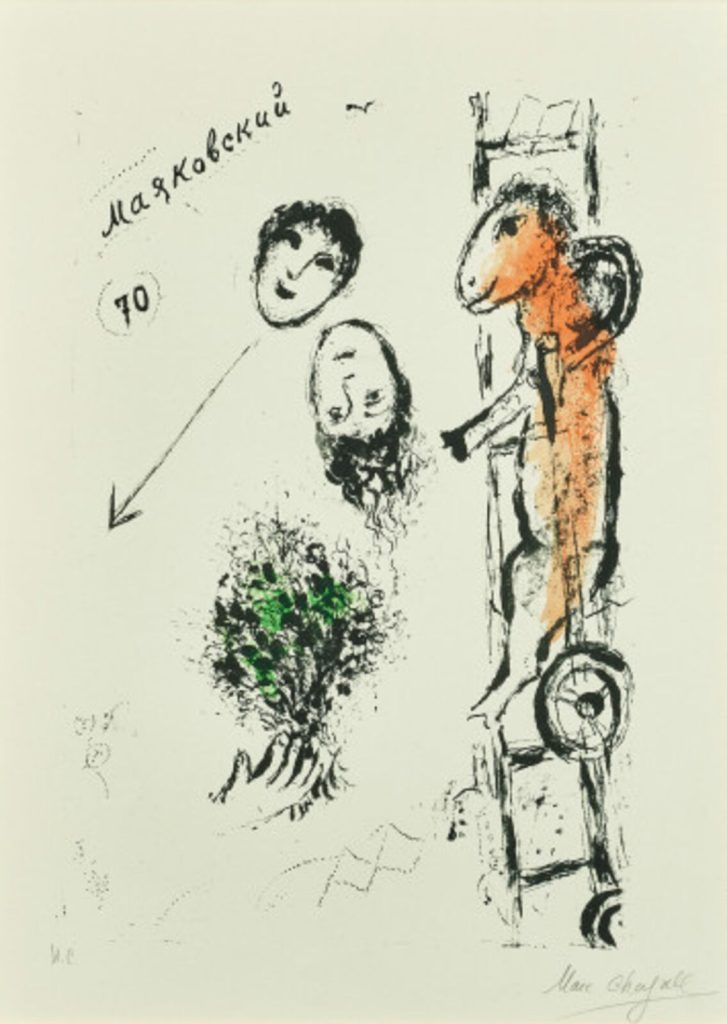 De afbeelding is een prent uit 1963 van Marc Chagal ter gelegenheid van Majakovski’s 70e geboortedag.